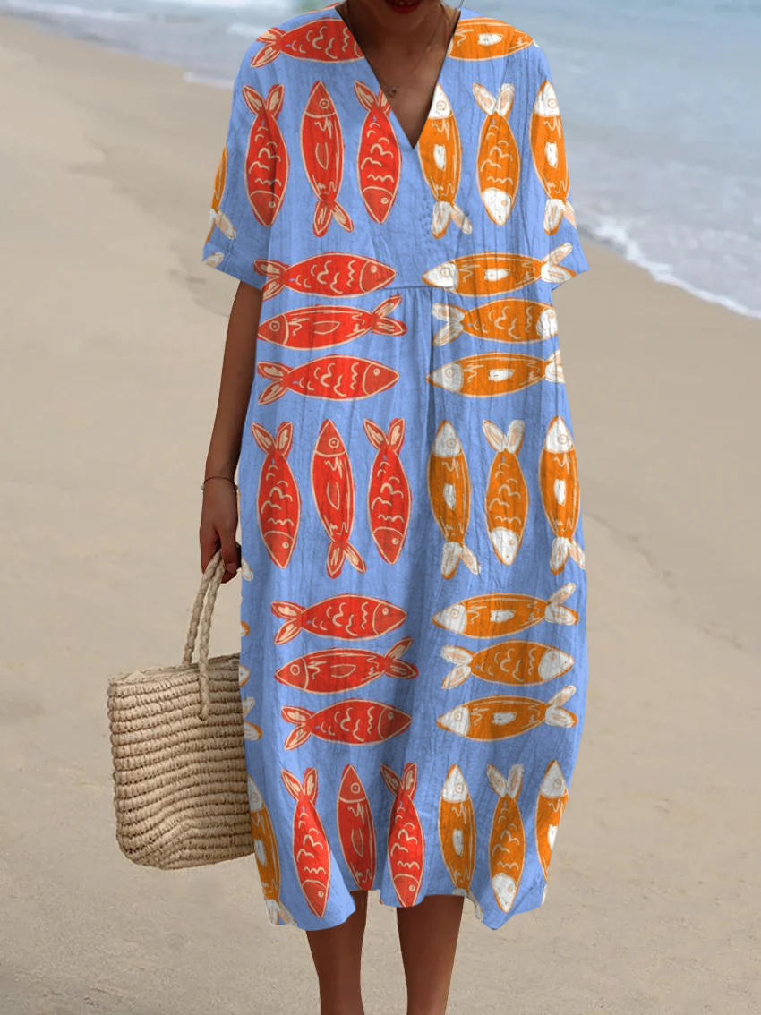 Women's Vintage Fish Art Print Flowy Dress